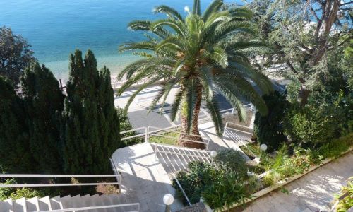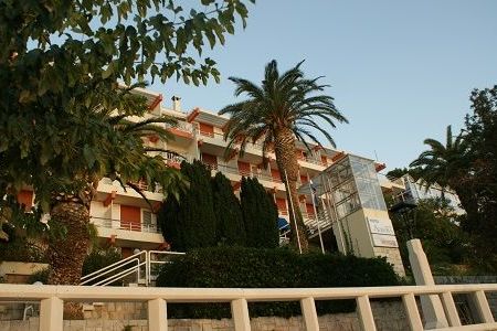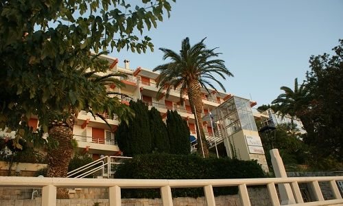 Lage: Am ruhigen Ortsrand gelegen, nur durch die Uferpromenade vom Meer getrennt. Unterhalb des Hotels befindet sich ein flach abfallender, sehr feiner Kiesstrand mit Liegen- und Sonnenschirmverleih. Zum Ortszentrum mit Straßencafés und Restaurants gelangt man zu Fuß über die Uferpromenade in ca. 5 Minuten.